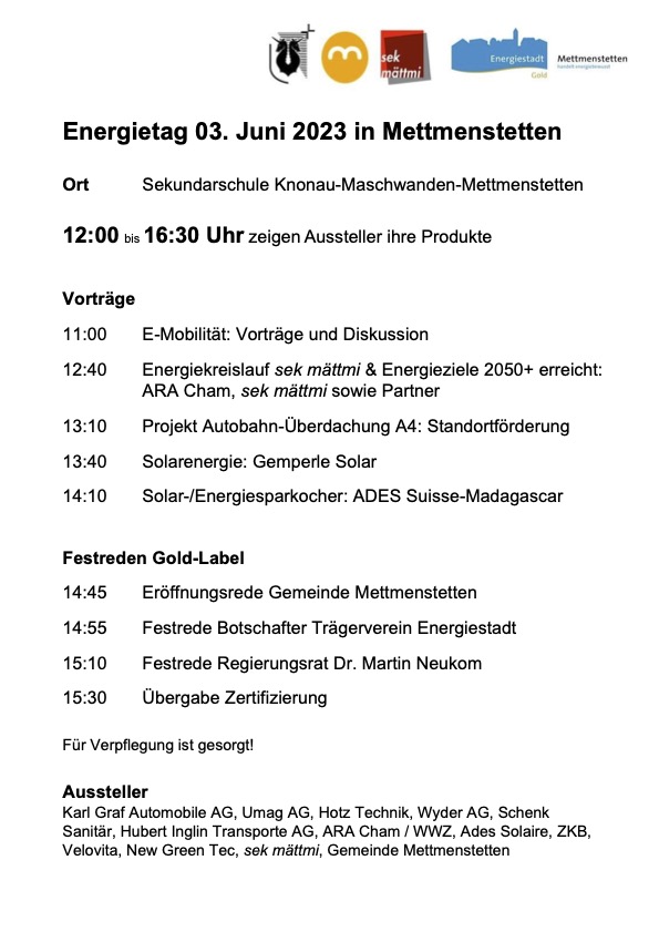 Das Programm kann unter folgendem Link herunter geladen werden: https://knonauer-amt.ch/wp-content/uploads/2023/05/Mettmenstetten_Energietag_20230423.pdf